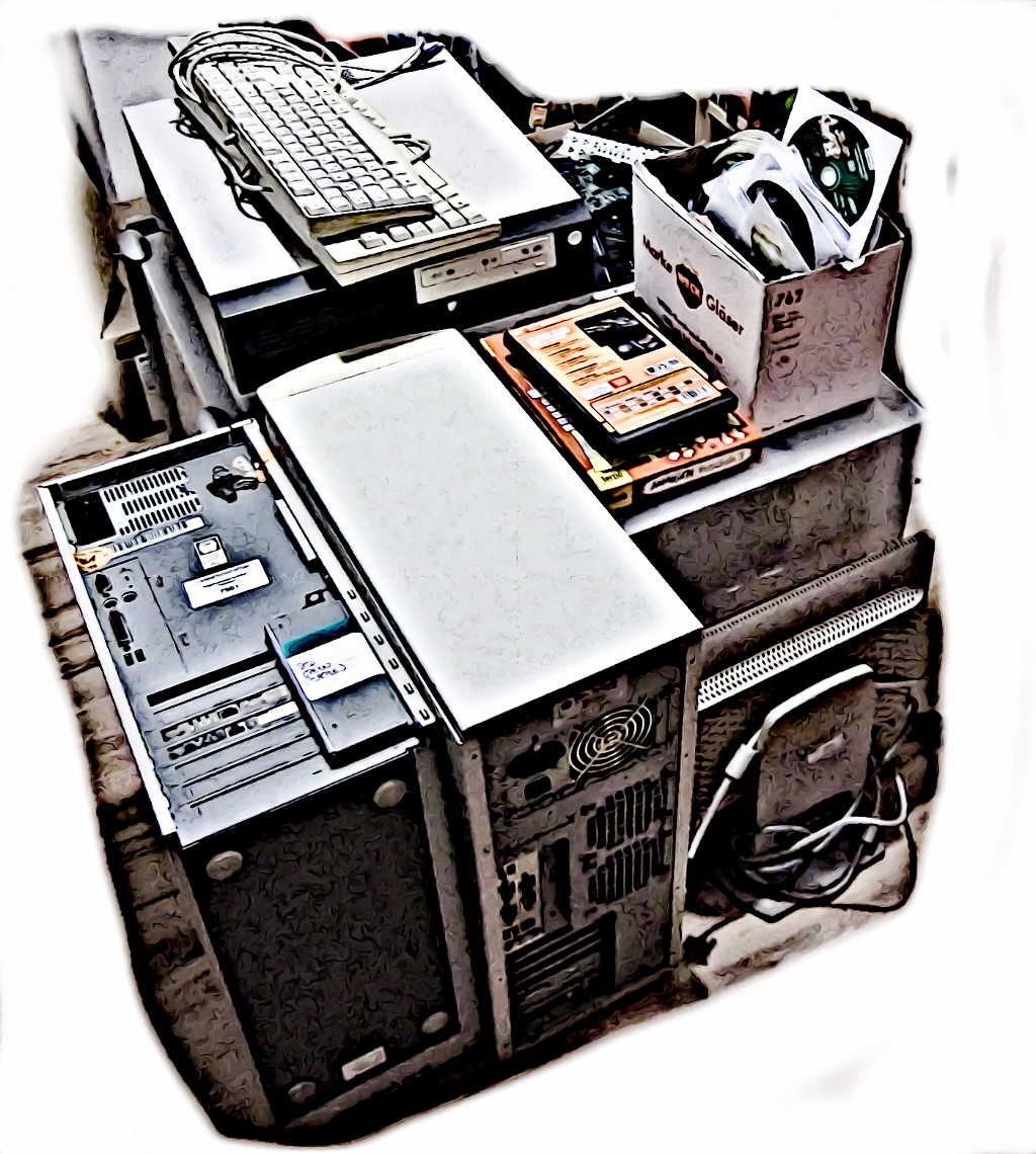 Nachdem Bela und ich ausgemistet hatten, stapelten sich die Rechner im Flur des Kellers. Im Bild oben fehlen sogar noch ein paar Dinge, darunter das PIII 850Mhz Laptop von Asus, das ich erst neulich noch mit AntiX bespielt hatte. Viele alte Lizenzen und Softwareverpackungen aus meinen Windowszeiten sind auch Teil des Müllberges – aber vor allem viele Dinge, von denen ich mich schwer trennen konnte. Eine Videoschnittkarte von Philips, eine ISA Soundblaster und das BigTower-Gehäuse meines letzten Hauptrechners … Seufz.