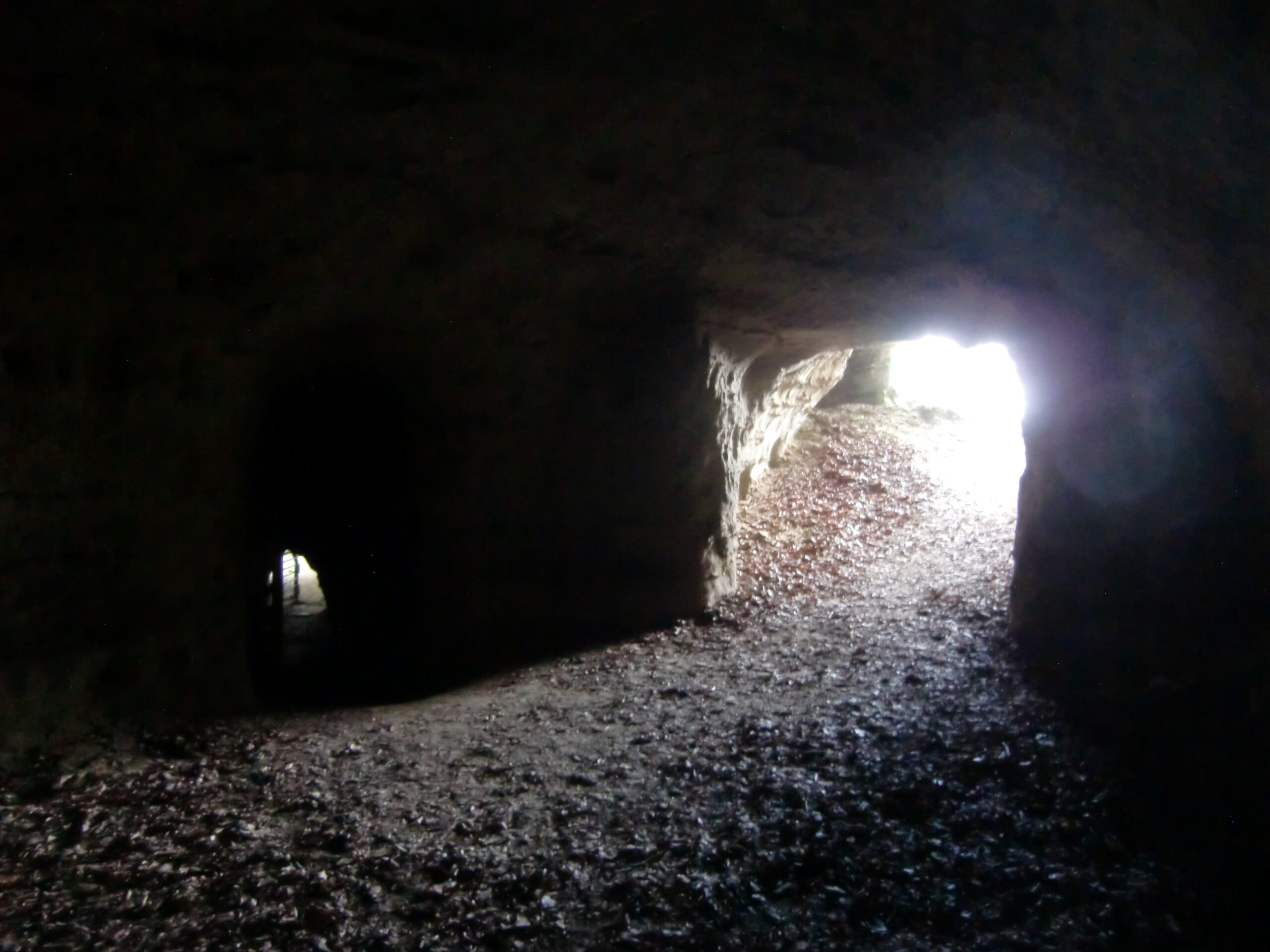 Durchgangshöhle (2) ← Zurück Weiter → Blick von der weiter oben gelegenen Kammer zurück durch den Gang zum unteren Eingang und rechts zum Ausgang.